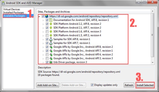 2. 좌측에 있는 Available Packages 를 선택하면 우측 창에 아래와 같은 사이트와 리스트 들이 나타나는데요, 그중 자신에게 필요한 버전별로 체크를 해서 하단의 Install Selected >> Accept All >> Install.