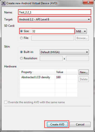 2. Create new Android Virtual Device AVD 창에서 사용자에 따라 임의의 Name 을 입력, Target 은 자신이 개발하고자 하는 Android 버전을 선택, Size 역시 필요한 만큼 임의로 입력해 주시고, "Create AVD" 를 클릭해 줍니다.