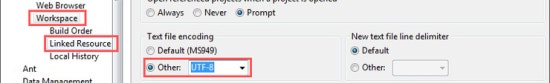 3. Window >> Preference >> General >> Workspace >> Text file encoding >> Other: UTF-8 선택합니다.