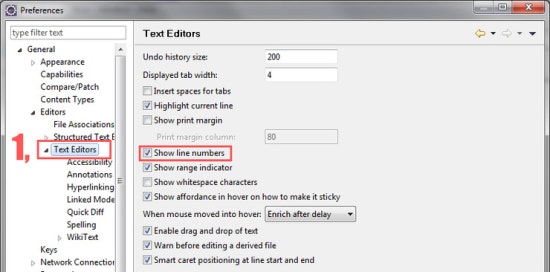 1. 상단 메뉴 바에서 Window >> Preferences >> General >> Editors >> Text Editors >> Show line numbers 체크 가 되어 있는지 확인.