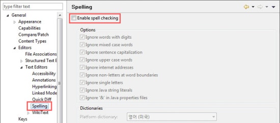 2. 다음은 Window >> Preferences >> General >> Editors >> Text Editors >> Spelling >> Enable spell checking 에서 체크를 해제.