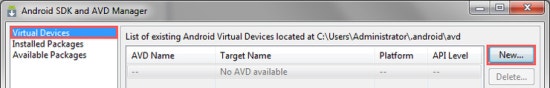 1. Android SDK and AVD Manager >> Virtual Devices >> New 클릭.