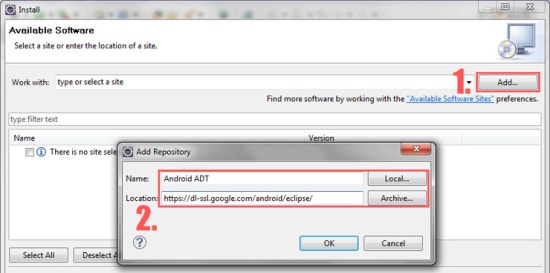 2. 나타나는 창의 우측에 있는 "Add..." 버튼을 클릭 한 다음, Name 은 "Android ADT" , Location 은 "http://dl-ssl.google.com/android/eclipse/ 로 설정 합니다.