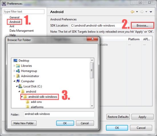 이제 정말, 진짜, 레알(?) 마지막으로 Eclipse 와 Android SDK 와의 연동만을 남겨 놓고 있습니다. 재 시작한 Eclipse 의 상단 메뉴의 window >> Preference >> Android 를 클릭해 우측의 SDK Location 의 Browse 를 통해 아까 C 드라이브에 만들어 놓은 Android SDK 경로를 지정해 주시면 되겠습니다.